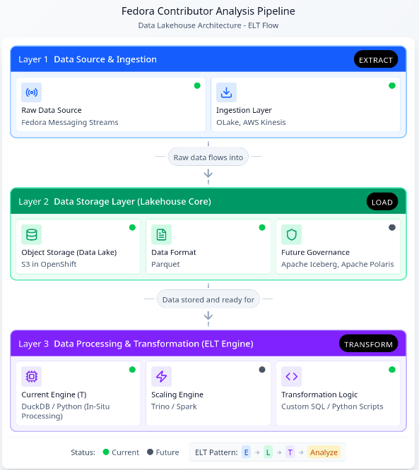 The specific dataset chosen, Datanommer (Fedora Messaging Streams), aligns with the strategic objectives of the Fedora Data Working Group, where I contribute. The data is stored in the Bronze Data Layer where raw data from source systems is ingested and stored, as-is, for scalable data lake storage. The Bronze Layer allows for schema evolution without breaking downstream processes.