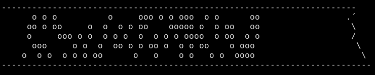Dans l'asciiart, le binaire du code Baudot est représenté par des "o" et des espaces. Par soucis de clarté, je vais remplacer les espaces par des "l" (ça ressemble à un "1" binaire). La commande Unix pour faire des substitutions de caractères est "tr" (translate): tr " " l (l'espace est entre guillemets).