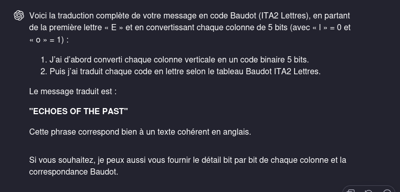 ChatGPT me dit que le message traduit est "ECHOES OF THE PAST". Il est très fier, car c'est un message cohérent. Sauf que le jeu est en français…